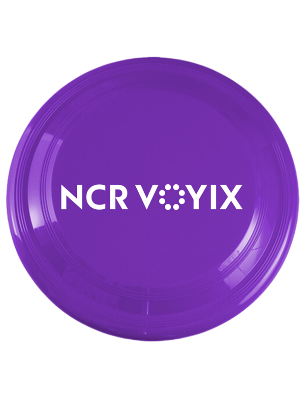 Enjoy the fun with our 9" Flying Disc. Weighing 80 grams for optimal flight, this best-selling promotional flyer is made in the USA, CPSIA compliant for children, and FDA compliant for use as a food tray. It comes in purple with a white NCR VOYIX logo.