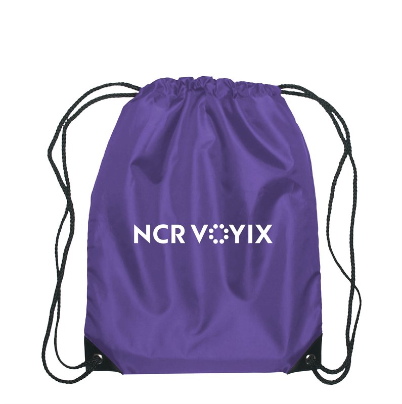 This Sports Sack is a versatile drawstring bag made from durable 210d polyester, featuring leather-like trim and reinforced eyelets. It's perfect for on-the-go use. The bag is purple with a white NCR VOYIX logo.