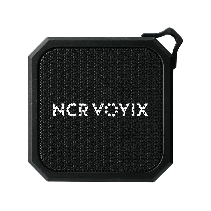 The rough and tough Blackwater Outdoor Waterproof Bluetooth Speaker can be taken on any adventure. Its compact size makes it effortless to carry, and the included carabiner clip attaches easily to your backpack for increased portability. This powerful 3W speaker has an IPX6 waterproof rating to protect it from damage in wet or rainy conditions. It charges in 1.5 hours and provides up to 2 hours of playback at maximum volume on a single charge. The Blackwater is compatible with Bluetooth 5.0, comes with a Micro USB cable, and has a Bluetooth working range of 33 feet (10 meters). NCR VOYIX logo printed in white