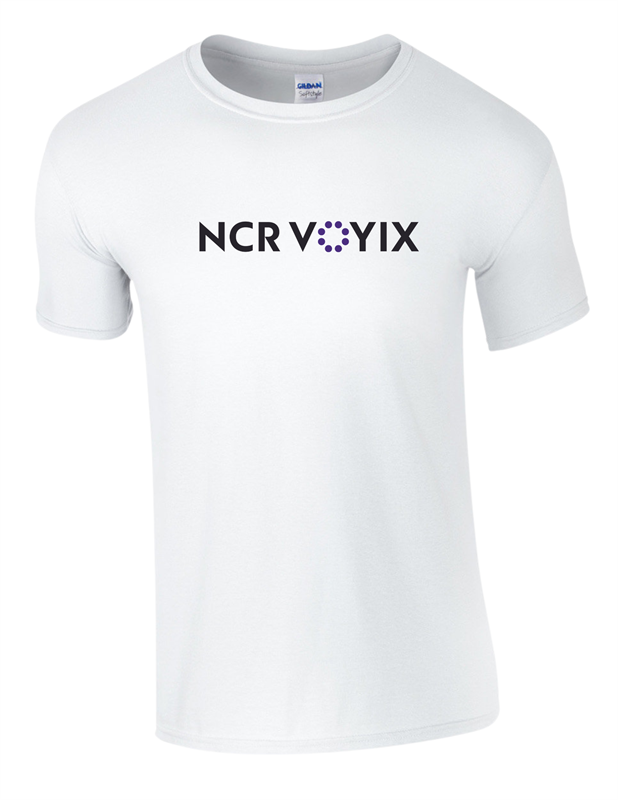 Elevate your comfort with the Adult Softstyle T-Shirt, made from 100% ring-spun cotton. Features include a rib collar, taped neck and shoulders, double-needle sleeves, and a tearaway label. The white shirt showcases the NCR Voyix logo in purple and black. Available in XS-4XL.