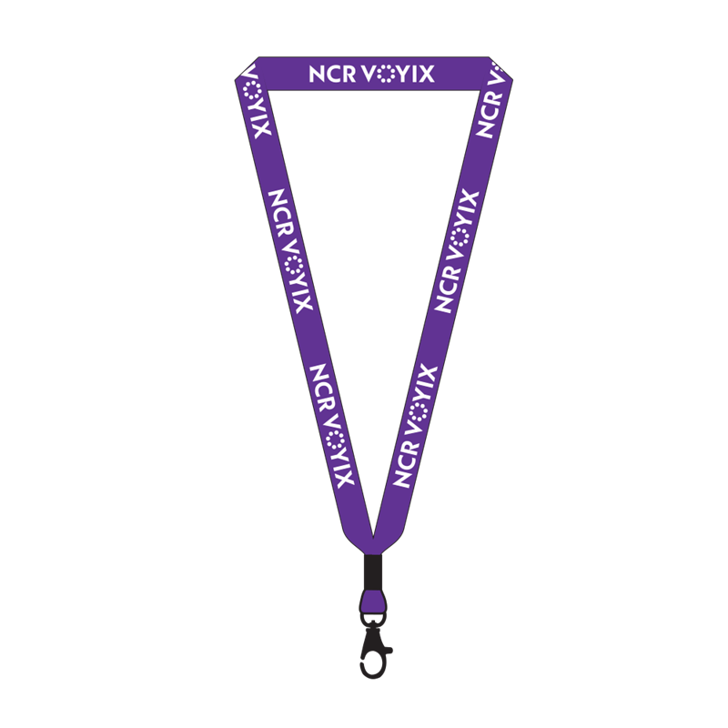 Keep your badge close while doing so in style. 3/4" dye sublimated lanyard with metal crimp ring and metal swivel snap hook. NCR Voyix purple lanyard with the logo in white.